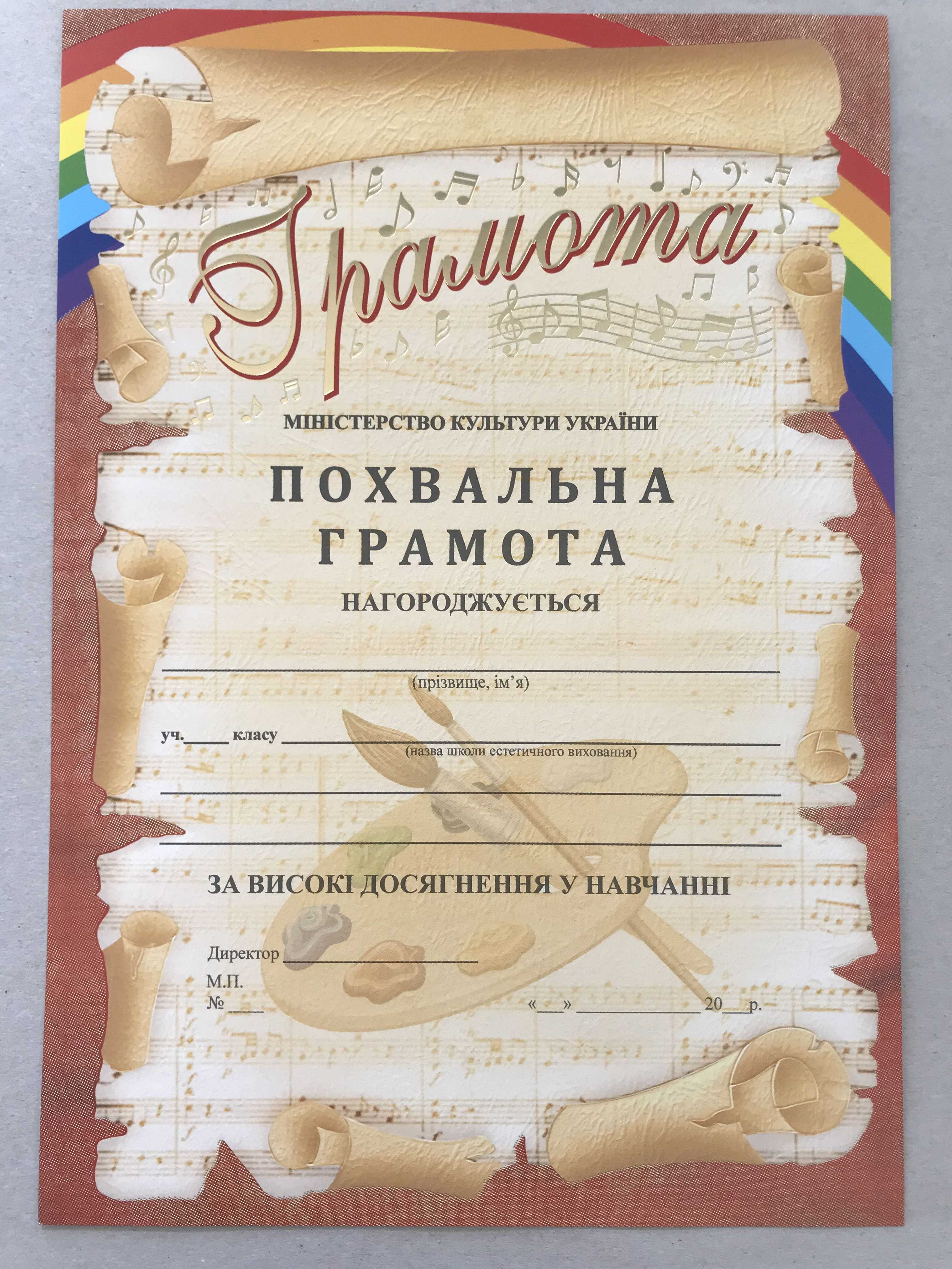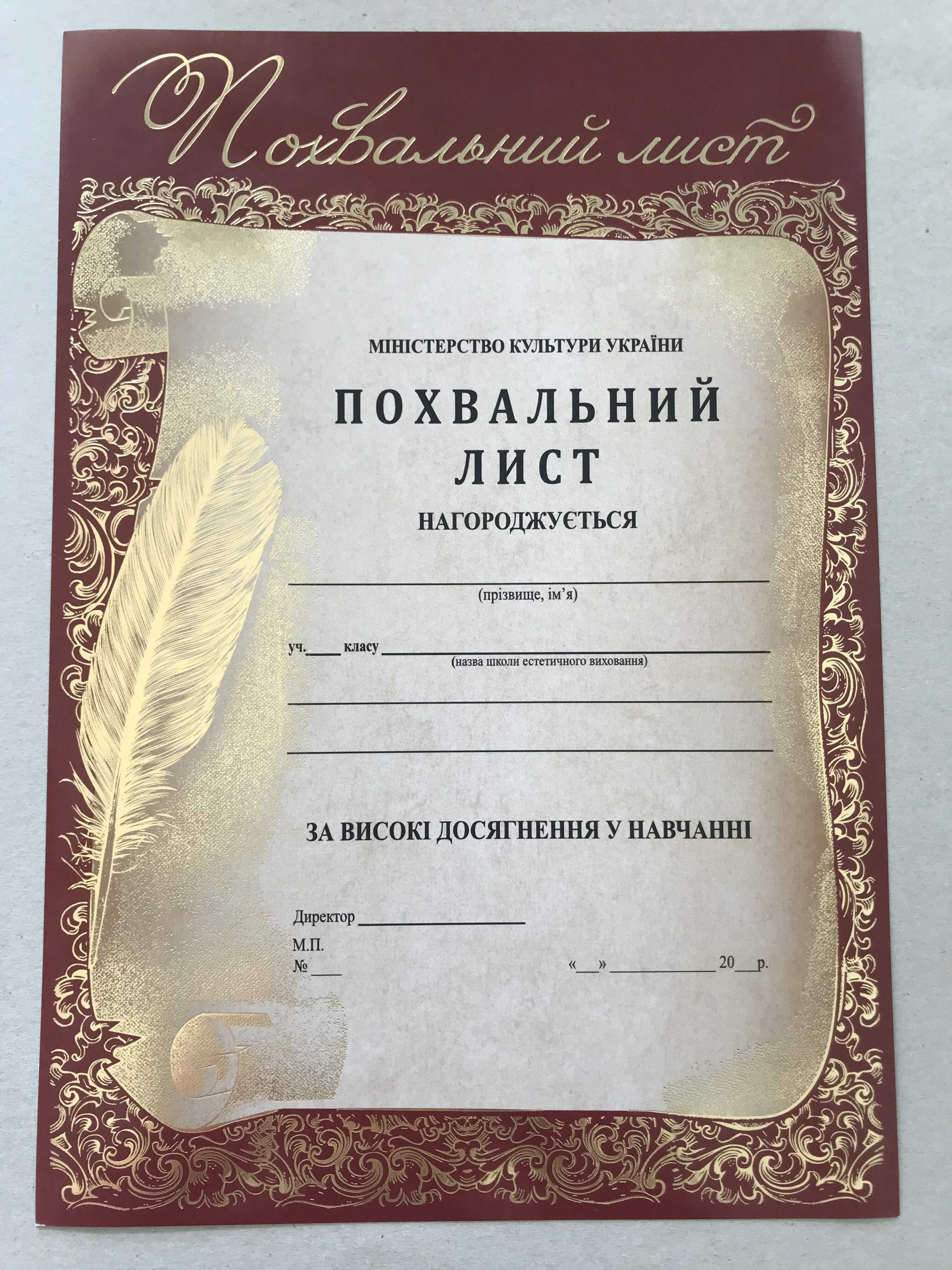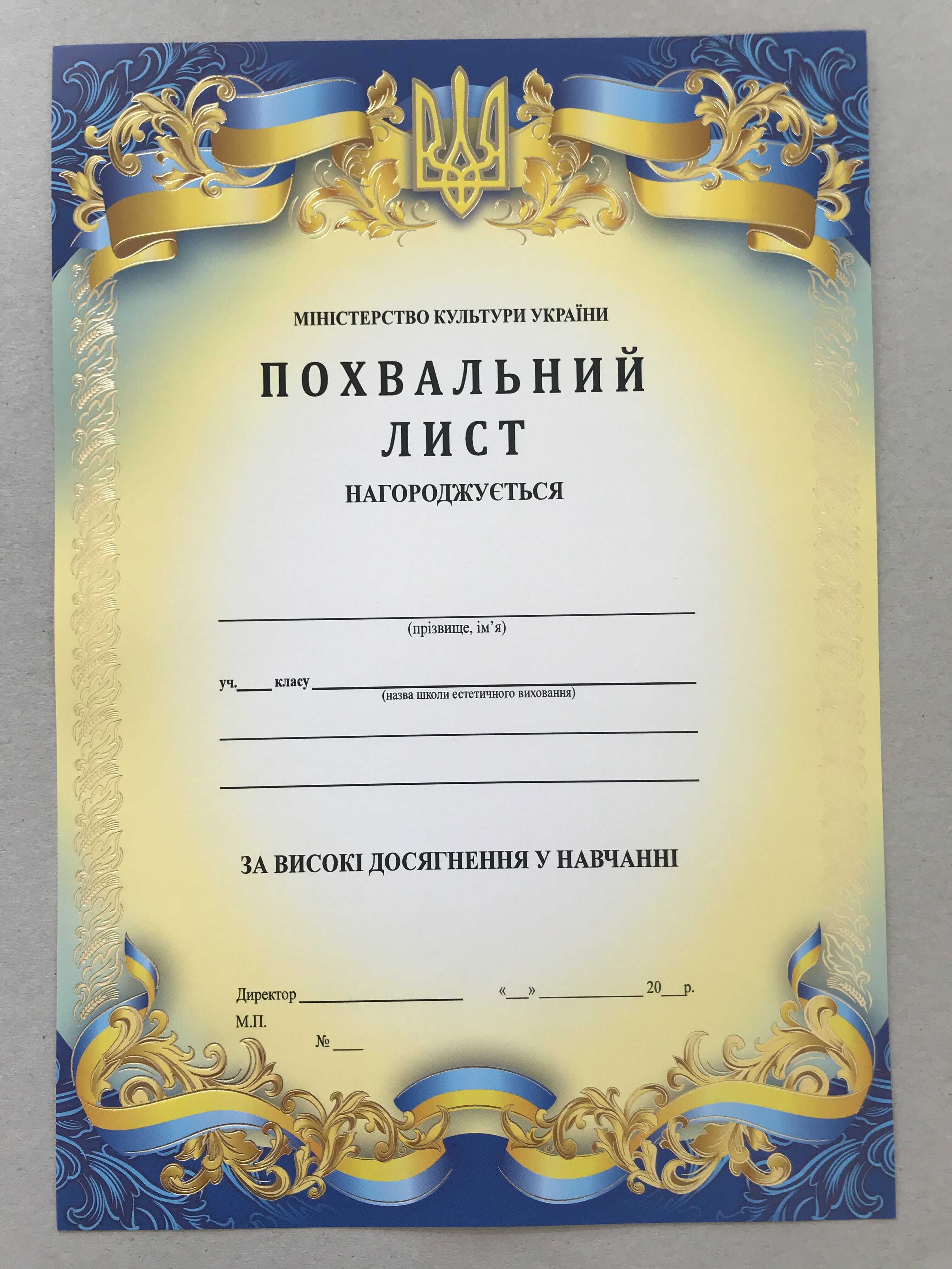 Бланк похвальної грамоти або листа виготовлений та роздрукований на крейдованому картоні щільністю 150-180 г/м2. Розмір бланка 210х297 мм. На бланці можливо надрукувати необхілний текст за допомогою стандартного принтера. Бланк похвального листа розроблений відповідно Наказу МОН 11.12.2000 № 579 (в редакції наказу МОН від 17.03.2008 № 187) Положення про похвальнi листи "За високі досягнення у навчанні" та похвальні грамоти "За особливі досягнення у вивченні окремих предметів" Замовити бланк похвального листа можна за контактами, вказаними на сайті. Замовляйте бланк похвального листа з доставкою. Ви отримаєте Ваше замовлення в максимально короткий термін в будь-яке місто України.
